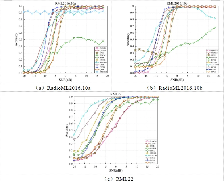 针对上述问题,蔡卓燃教授团队提出了一种基于跨分支融合卷积和高效Transformer的鲁棒调制识别模型。实验结果表明,所提出的方法能够在低信噪比条件下提取更具判别性的特征,并保持较高的识别精度。同时,在数据特征分布存在差异及未知信噪比信号场景下,该模型表现出较小的性能衰减,体现出良好的鲁棒性。此外,该方法在各类调制方式上均取得了优良性能,尤其在易混淆的QAM16、QAM64、WBFM和AM-DSB类别中,展现出更为突出的区分能力。
